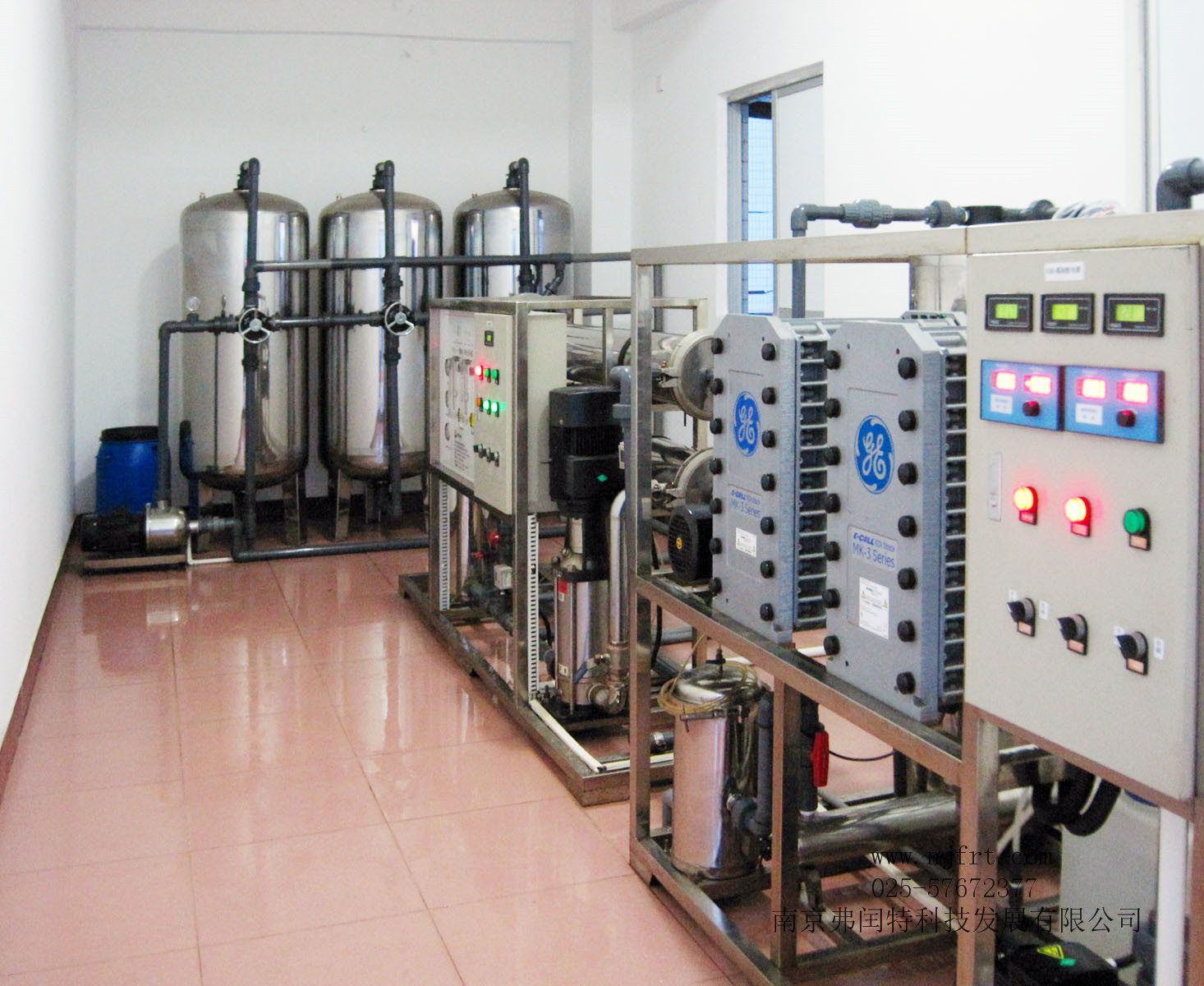 电法离子交换系统(EDI)亦是一种离子交换系统,这种离子交换系统使用一个混合树脂床,采用选择性的渗透膜以及充电器,以保证水处理的连续进行和树脂的连续再生。处理工艺为,原水首先进入树脂段,当水通过树脂时,被脱去金属电荷离子,成为产品水。这种系统使用的树脂可以看作为一个导体,在电位势能的作用下,迫使被俘获的阴、阳离子通过树脂和渗透膜而浓缩,并从水流中脱出。与此同时,在树脂段中,电位的势能又将水电解成氢离子和氢氧根离子,从而使树脂得以连续再生,且不需要添加再生剂。